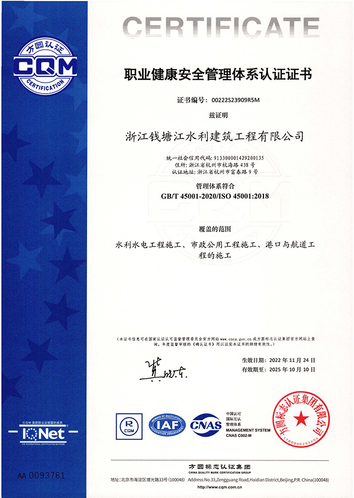 職業健康安全管理體系認證證書