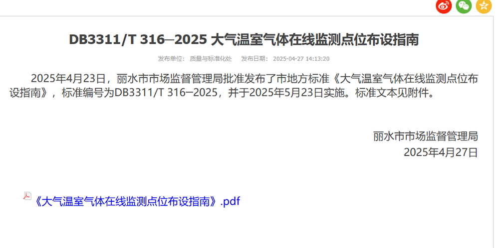 2025年5月23日,由省環保集團牽頭起草的地方標準《大氣溫室氣體在線監測點位布設指南》(標準編號:DB3311/T 316─2025)正式實施。