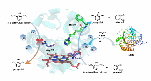 研究團(tuán)隊(duì)通過(guò)計(jì)算機(jī)模擬、基因工程及化學(xué)修飾等多維優(yōu)化策略,構(gòu)建了一種基于細(xì)胞色素P450BM3-糖醇氧化酶(Sugar Alcohol Oxidase,AldO)的復(fù)合生物催化體系,在雙功能小分子(Dual functional small molecule,DFSM)的輔助下,實(shí)現(xiàn)了愈創(chuàng)木酚(G-木質(zhì)素單體)的高效脫甲基化(TON=1895±4)和2, 6-二甲氧基苯酚(S-木質(zhì)素單體)的雙脫甲基轉(zhuǎn)化(TON=483±7)。該生物催化體系經(jīng)濟(jì)實(shí)用,為木質(zhì)素芳香族化合物的生物催化降解提供了創(chuàng)新性的解決方案。該研究不僅拓寬了血紅素蛋白的應(yīng)用領(lǐng)域,也為人工金屬酶的理性設(shè)計(jì)與應(yīng)用提供了新的理論依據(jù)和技術(shù)路徑。