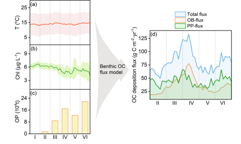 研究團(tuán)隊(duì)聚焦北方規(guī)模化養(yǎng)殖海灣-桑溝灣,通過分析近百年沉積巖芯,發(fā)現(xiàn)集約化牡蠣養(yǎng)殖使沉積物有機(jī)碳埋藏通量提升2.6倍,達(dá)91.6–106g C·m-2·yr-1,這一效率可以比擬紅樹林、海草床等典型藍(lán)碳生態(tài)系統(tǒng)。其中,微生物殘?bào)w是沉積有機(jī)碳的關(guān)鍵組成部分,貢獻(xiàn)率在30–42%,遠(yuǎn)高于非養(yǎng)殖區(qū)7–22%。而借由微生物殘?bào)w形成難降解有機(jī)碳占比從養(yǎng)殖前的42.5%升至60.2%,從而增強(qiáng)了沉積碳的穩(wěn)定性。以此推算,全球牡蠣養(yǎng)殖每年可促成約47萬(wàn)噸碳沉積,其中28萬(wàn)噸以難降解形式長(zhǎng)期封存。廣義線性混合模型(GLMM)分析顯示,牡蠣產(chǎn)量、生物沉積通量與溫度是埋藏效率的顯著負(fù)驅(qū)動(dòng)因子。