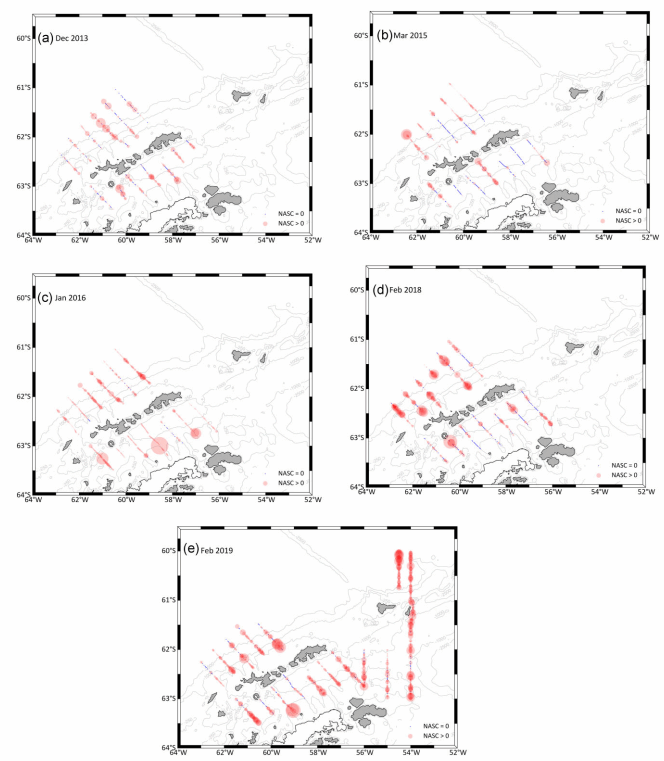 近日,中國水產(chǎn)科學(xué)研究院黃海水產(chǎn)研究所遠(yuǎn)洋與極地漁業(yè)資源開發(fā)利用團(tuán)隊(duì)在南極磷蝦(Euphausia superba)資源評估與中心漁場形成機(jī)制研究方面取得系列新進(jìn)展,相關(guān)成果分別發(fā)表于國內(nèi)外漁業(yè)領(lǐng)域權(quán)威期刊《ICES Journal of Marine Science》《Marine and Coastal Fisheries》及《中國水產(chǎn)科學(xué)》。上述系列研究通過深度挖掘我國磷蝦漁船采集聲學(xué)數(shù)據(jù),系統(tǒng)揭示了南極半島周邊海域南極磷蝦資源的動態(tài)變化特征,進(jìn)一步明確了環(huán)境驅(qū)動因子對中心漁場形成與資源聚集的關(guān)鍵作用,為南極磷蝦漁業(yè)科學(xué)管理和可持續(xù)利用提供了基礎(chǔ)科學(xué)依據(jù)。