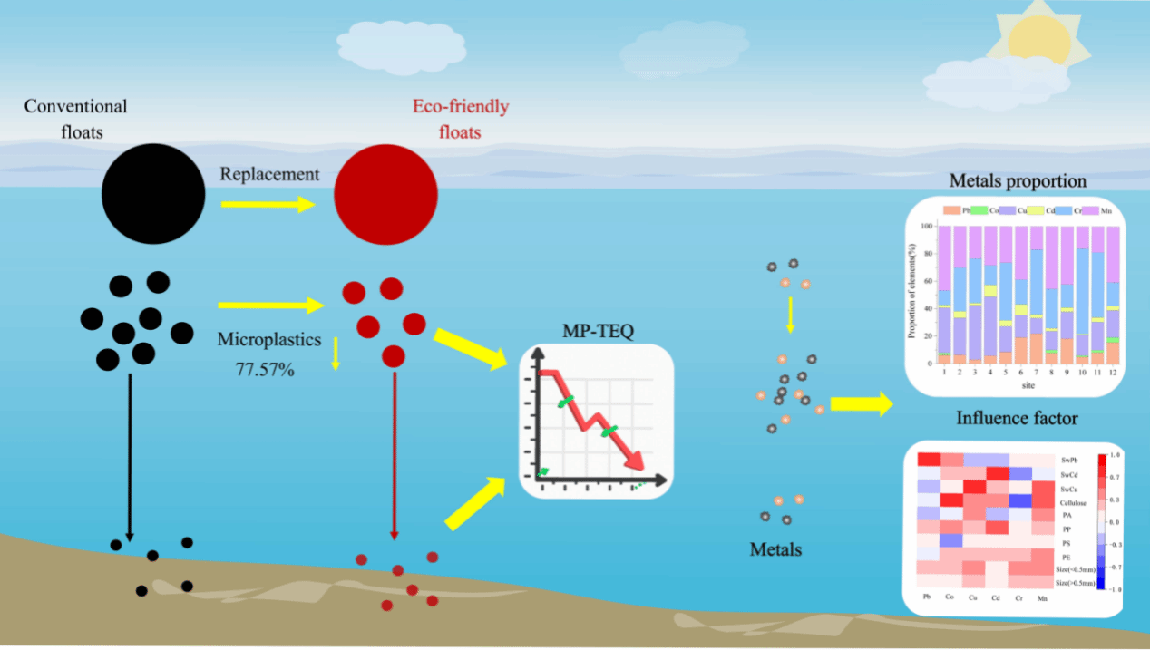 在應(yīng)對(duì)措施方面,海水養(yǎng)殖區(qū)正逐步以生態(tài)養(yǎng)殖浮漂替代傳統(tǒng)浮漂,然而這一舉措對(duì)微塑料污染的實(shí)際緩解效果缺乏評(píng)估。同時(shí),海洋環(huán)境中微塑料對(duì)金屬的吸附行為也亟待闡明。本研究對(duì)比分析了桑溝灣生態(tài)浮漂更換前后微塑料的污染特征。發(fā)現(xiàn)生態(tài)浮漂更換后,表層海水中微塑料豐度下降了77.57%。海水和沉積物中的微塑料毒性當(dāng)量值均顯著降低,證實(shí)生態(tài)浮漂更換可有效減輕微塑料污染。進(jìn)一步對(duì)表層海水中微塑料吸附金屬的分析表明,錳(Mn)、鉻(Cr)和銅(Cu)占總吸附量的84%以上,其吸附行為受到微塑料尺寸、聚合物類型和環(huán)境金屬濃度的共同調(diào)控。研究結(jié)果證實(shí)了生態(tài)浮漂更換是治理養(yǎng)殖區(qū)微塑料污染的有效手段(Sui et al., 2025, Marine Environmental Research)。