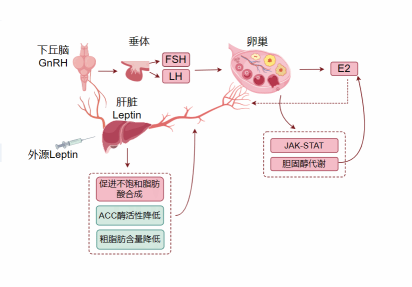 研究發(fā)現(xiàn),Leptin通過“肝-腦-性腺”軸調(diào)控生殖內(nèi)分泌。研究證實,Leptin能影響下丘腦-垂體-性腺(HPG)軸關(guān)鍵基因的表達。例如,rLepA和rLepB處理可上調(diào)腦中kiss2、gnrh3以及垂體中fshβ、lhβ等啟動和維持生殖周期的核心調(diào)控因子基因的表達。這表明Leptin可能作為能量狀態(tài)的信號分子,在能量儲備充足時,激活HPG軸,促進生殖發(fā)育;反之則可能抑制該進程。