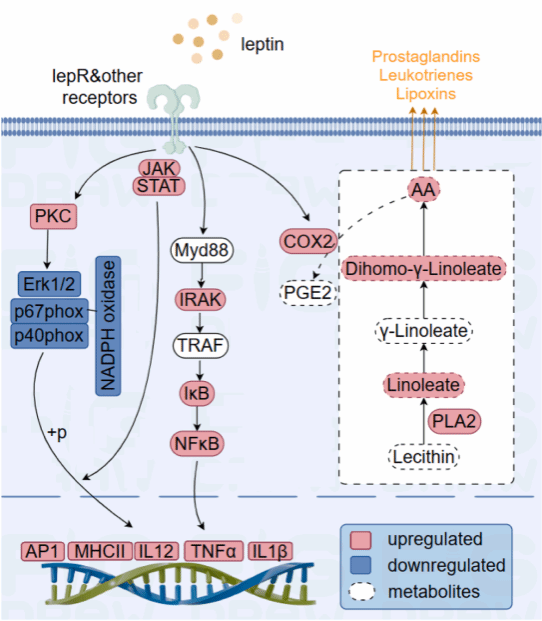 研究發(fā)現(xiàn),Leptin作為代謝樞紐,協(xié)調(diào)脂質(zhì)代謝與生殖信號。體內(nèi)注射研究表明,外源性rLepB能顯著降低半滑舌鰨豐滿度、肝臟乙酰-CoA及肌肉粗脂肪含量,表現(xiàn)出“減脂”效應(yīng)。轉(zhuǎn)錄組與代謝組聯(lián)合分析揭示,Leptin蛋白處理能顯著下調(diào)飽和脂肪酸合成,同時促進多不飽和脂肪酸(PUFA),如二十二碳六烯酸(DHA)、花生四烯酸(ARA)等的生物合成。這些 PUFA 不僅是細胞膜的重要組成部分,更是合成類固醇激素(如性激素)的前體,直接將代謝狀態(tài)與生殖潛能相聯(lián)系。