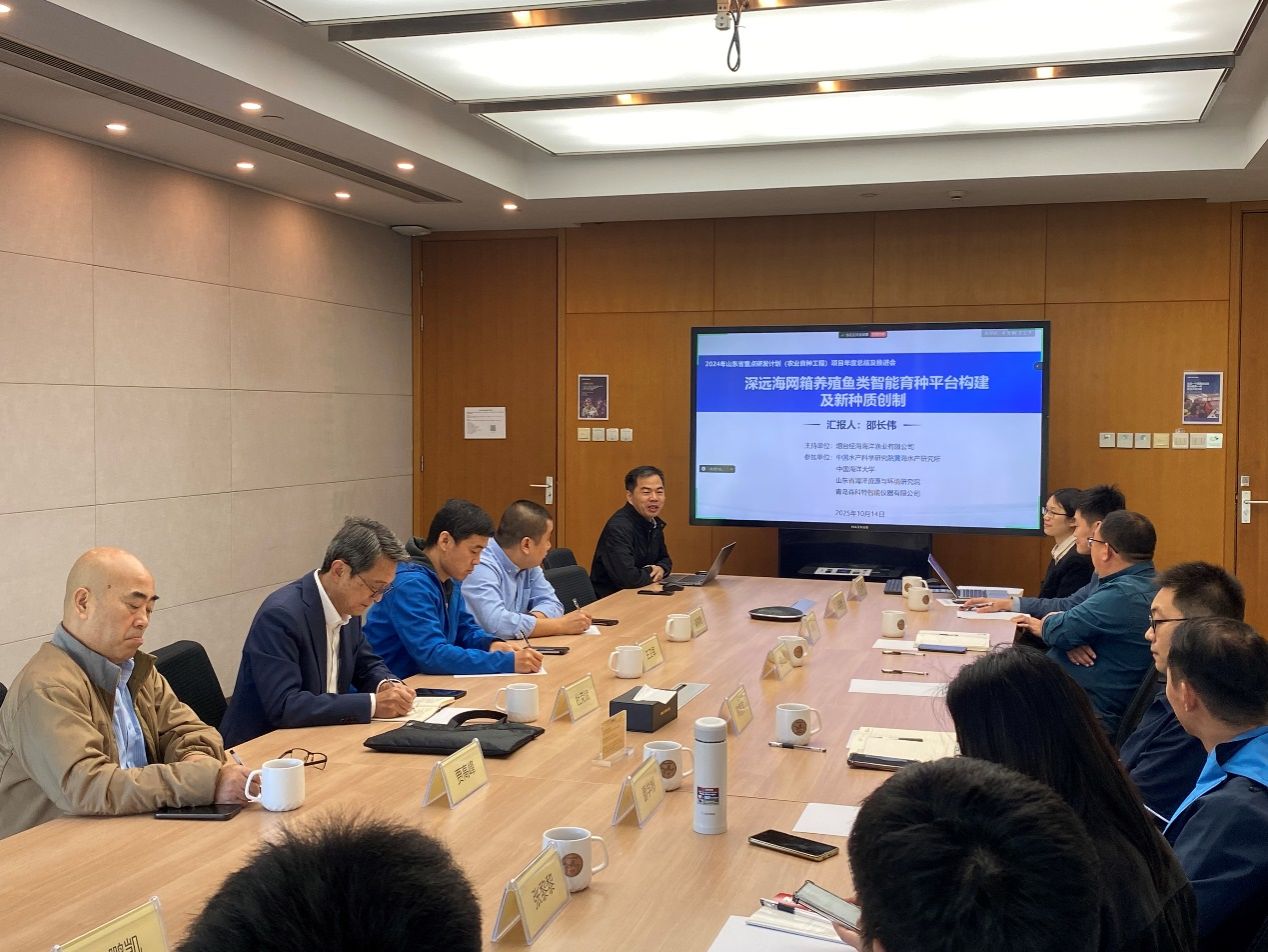 10月14日,山東省重點(diǎn)研發(fā)計(jì)劃(農(nóng)業(yè)良種工程)“深遠(yuǎn)海網(wǎng)箱養(yǎng)殖魚類智能育種平臺構(gòu)建及新種質(zhì)創(chuàng)制”項(xiàng)目年度總結(jié)及推進(jìn)會在煙臺召開,煙臺大學(xué)杜榮斌教授、魯東大學(xué)王衛(wèi)軍教授、煙臺市海洋經(jīng)濟(jì)研究院姜黎明正高級工程師、華智生物技術(shù)與數(shù)據(jù)科學(xué)創(chuàng)新研究院執(zhí)行副院長賈高峰研究員作為項(xiàng)目咨詢專家組專家應(yīng)邀參會,項(xiàng)目技術(shù)負(fù)責(zé)人中國水產(chǎn)科學(xué)研究院黃海水產(chǎn)研究所副所長邵長偉研究員、項(xiàng)目行政負(fù)責(zé)人煙臺經(jīng)海海洋漁業(yè)有限公司總經(jīng)理郭福元和項(xiàng)目組成員等10余人參會。會議由項(xiàng)目承擔(dān)單位負(fù)責(zé)人煙臺經(jīng)海海洋漁業(yè)有限公司科研部經(jīng)理張黎黎主持。