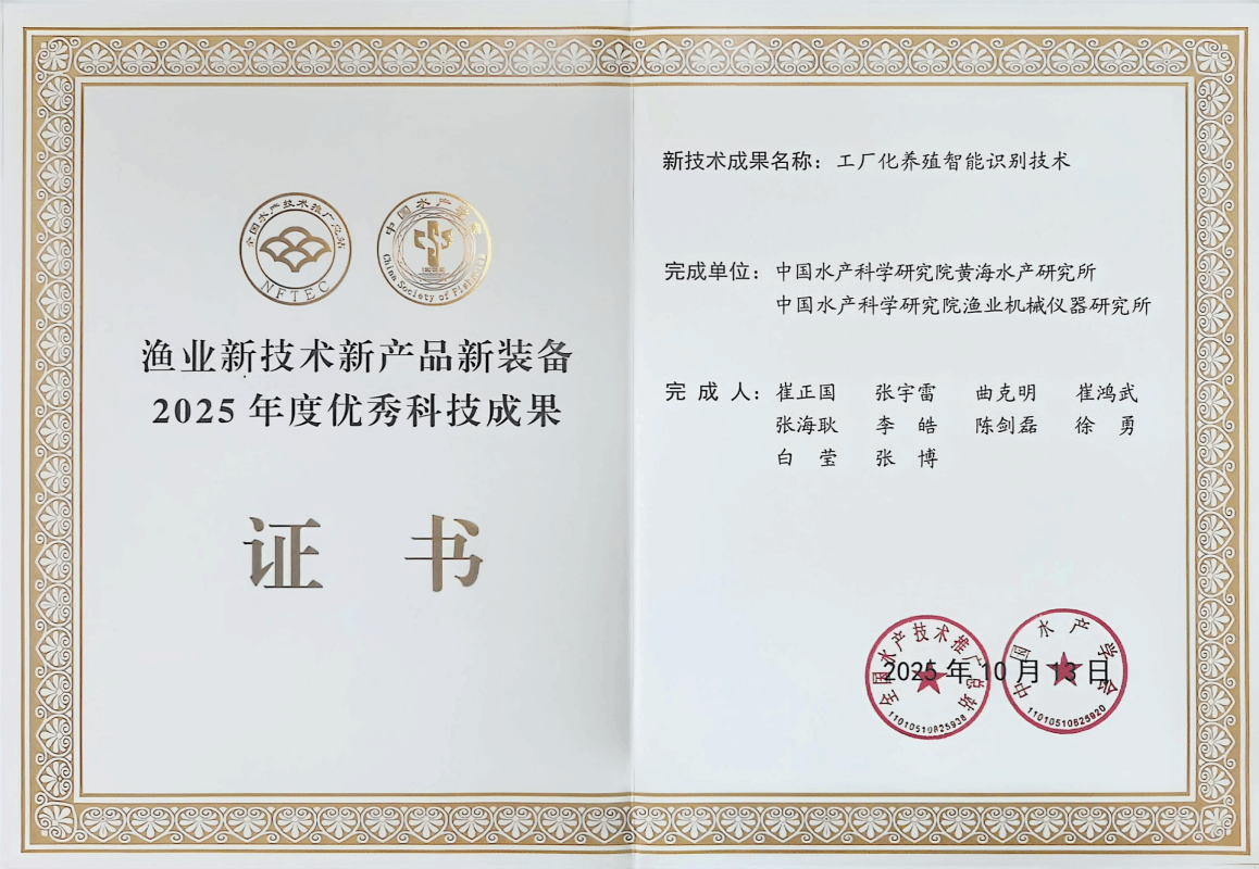 近日,全國(guó)水產(chǎn)技術(shù)推廣總站、中國(guó)水產(chǎn)學(xué)會(huì)發(fā)布了漁業(yè)新技術(shù)新產(chǎn)品新裝備2025年度優(yōu)秀科技成果的通知,經(jīng)單位推薦、形式審查、專家通訊評(píng)審、評(píng)審委員會(huì)現(xiàn)場(chǎng)評(píng)審等程序,共遴選出漁業(yè)優(yōu)秀科技成果20項(xiàng),其中新技術(shù)14項(xiàng)、新產(chǎn)品2項(xiàng)、新裝備4項(xiàng)。中國(guó)水產(chǎn)科學(xué)研究院黃海水產(chǎn)研究所牽頭完成的“工廠化養(yǎng)殖智能識(shí)別技術(shù)”“刺參淺海網(wǎng)箱高產(chǎn)養(yǎng)殖技術(shù)”等2項(xiàng)技術(shù)成功入選“新技術(shù)”類優(yōu)秀科技成果。