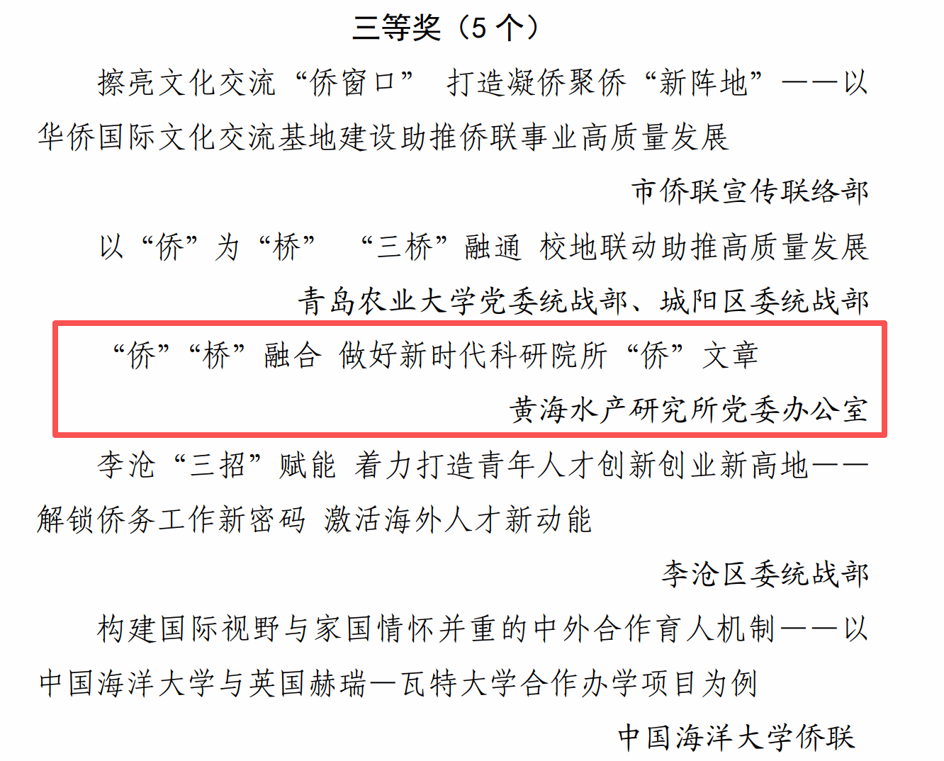 近日,青島市僑聯(lián)公布了2025年全市僑聯(lián)系統(tǒng)改革創(chuàng)新案例和調(diào)研成果獲獎名單,中國水產(chǎn)科學研究院黃海水產(chǎn)研究所申報的改革創(chuàng)新案例《“僑”“橋”融合 做好新時代科研院所“僑”文章》在評選中榮獲三等獎,是本次改革創(chuàng)新案例評選中唯一獲獎的科研院所,充分體現(xiàn)了黃海所在推動“僑”“橋”深度融合、創(chuàng)新工作方式、完善服務載體等方面取得的實踐成果。