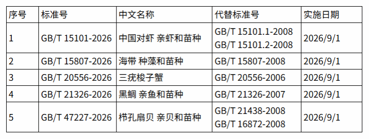 近日,根據(jù)國家市場監(jiān)督管理總局(國家標(biāo)準(zhǔn)化管理委員會(huì))發(fā)布的2026年國家標(biāo)準(zhǔn)批準(zhǔn)發(fā)布公告(2026年第9號(hào)),由中國水產(chǎn)科學(xué)研究院黃海水產(chǎn)研究所主持修訂的《中國對蝦 親蝦和苗種》《海帶 種藻和苗種》《三疣梭子蟹》《黑鯛 親魚和苗種》《櫛孔扇貝 親貝和苗種》等5項(xiàng)國家標(biāo)準(zhǔn)正式獲批發(fā)布。