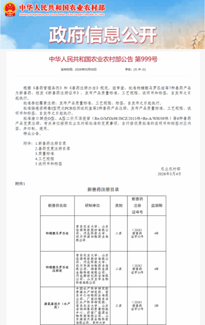 3月6日,農業(yè)農村部發(fā)布第999號公告,由中國水產科學研究院黃海水產研究所水產動物藥理與疾病臨床團隊牽頭研制的“溴氯海因片(水產用)”正式獲批中華人民共和國三類新獸藥注冊證書[證號:(2026)新獸藥證字35號],這是黃海所獲批的首個新獸藥注冊證書,主要研發(fā)人員包括張正、王春元、于永翔、王印庚、榮小軍等。公告同步發(fā)布了該新獸藥的產品質量標準、工藝規(guī)程、說明書和標簽,自發(fā)布之日起正式執(zhí)行。