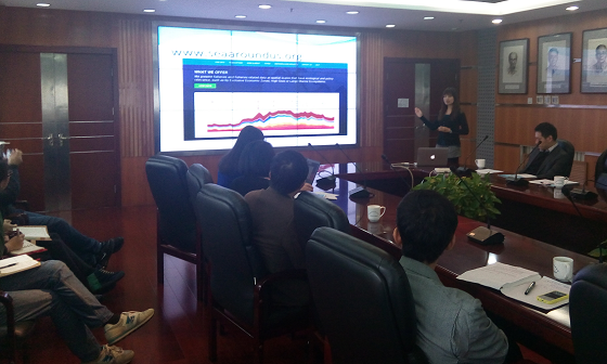會上,單秀娟副研究員簡要介紹了黃海所漁業(yè)資源與生態(tài)系統(tǒng)研究室概況以及與William Cheung博士合作的973項目進(jìn)展情況,就近海漁業(yè)資源對氣候變化的響應(yīng)與來訪專家進(jìn)行了深入交流和研討,并進(jìn)一步明確了今后的工作計劃及工作重點。William Cheung博士作了題為“Marine fisheries and biodiversity under global change”的報告,介紹了氣候變化背景下全球漁業(yè)資源和生物多樣性的演變趨勢。Vicky Lam博士作了題為“Reconstructing the marine fisheries catch of countries: the rationale, methods and findings so far”的報告,介紹了在漁業(yè)捕撈數(shù)據(jù)缺失的情況下,漁業(yè)數(shù)據(jù)重建的過程及實現(xiàn)漁業(yè)數(shù)據(jù)重建的幾個典型事例。