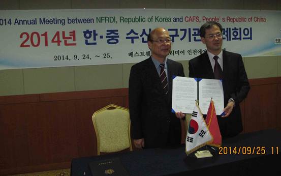 在兩院年會上,中韓雙方總結(jié)了2013-2014年各項合作項目的實施情況,商討和落實了2015年的科技合作研究項目。劉英杰副院長與韓國國立水產(chǎn)科學(xué)院Chui-Won Jeung副院長代表雙方簽署了2014年中韓兩院年會會議紀(jì)要。
