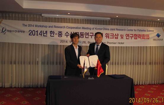 在中韓漁業(yè)聯(lián)合研究中心年會上,中心代表單位黃海所與西海水產(chǎn)研究所的代表人員總結(jié)討論了2014年兩所之間合作研究的相關(guān)事宜,落實了2014年的后續(xù)工作,并研討提出了2015年合作研究的議題。中心副主任孔杰副所長和La In Cheol副所長代表雙方簽署了2014年中韓漁業(yè)聯(lián)合研究中心合作研究會議紀(jì)要。