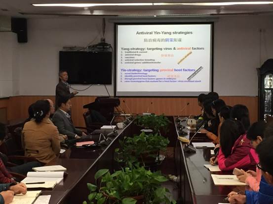 會上,洪云漢教授做了題為“Yin-Yang strategies of antiviral seed biotechnology in aquaculture”的學(xué)術(shù)報告,詳細介紹了其研究團隊在魚類抗病毒方面的研究進展,提出從宿主和病原兩個方面入手研究免疫機制,為參會人員提供了嶄新的視角和思路,引起了大家的廣泛興趣和熱烈討論。與會人員還就魚類免疫基因篩選及抗病苗種培育技術(shù)等方面與洪云漢教授進行了深入探討與交流。