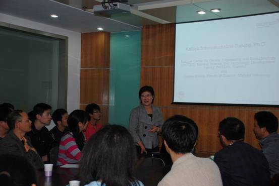 Dr. Kallaya Dangtip是 Centex Shrimp (泰國瑪希隆大學杰出人才中心對蝦研究組)的主要成員,主要從事對蝦免疫學及對蝦病毒致病機理研究,在該研究領域造詣頗深。此前,黃海所病研室梁艷博士曾于2008年10月以交換研究者的身份在Centex Shrimp進行為期了1年的合作研究,為雙方合作和交流起了良好的促動作用。