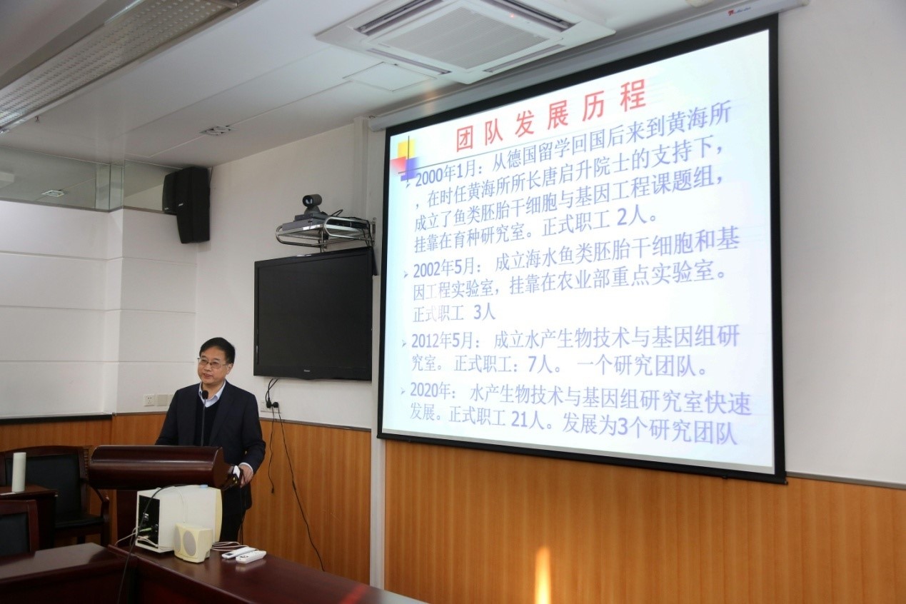 基因組室主任陳松林研究員感謝歷屆所領(lǐng)導(dǎo)班子對(duì)基因組室工作的關(guān)心與支持,并回顧了研究室科研團(tuán)隊(duì)從無(wú)到有、從弱到強(qiáng)的發(fā)展歷程,總結(jié)了團(tuán)隊(duì)建設(shè)和學(xué)科發(fā)展現(xiàn)狀以及取得的豐碩成果。李健副所長(zhǎng)充分肯定了基因組室取得的成績(jī),提出今后要更加重視漁業(yè)科技領(lǐng)域原始創(chuàng)新、技術(shù)成果應(yīng)用轉(zhuǎn)化、青年科研人才培養(yǎng)以及加強(qiáng)與畜牧領(lǐng)域合作等建議。