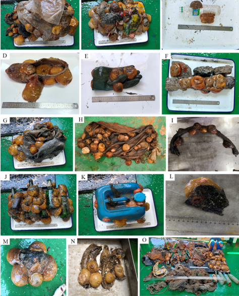 圖1. 須毛高齡細指海葵(Metridium senile fimbriatum) 在不同類型海底垃圾上附著