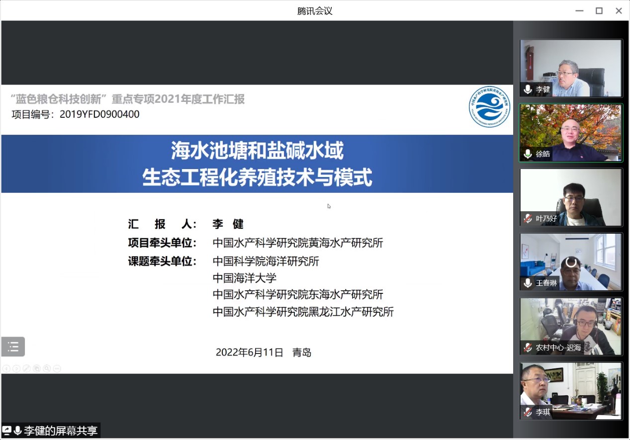 6月11日,中國(guó)水產(chǎn)科學(xué)研究院黃海水產(chǎn)研究所牽頭承擔(dān)的國(guó)家重點(diǎn)研發(fā)計(jì)劃“藍(lán)色糧倉(cāng)科技創(chuàng)新”重點(diǎn)專項(xiàng)“海水池塘和鹽堿水域生態(tài)工程化養(yǎng)殖技術(shù)與模式”2021年度總結(jié)與工作推進(jìn)會(huì)以視頻會(huì)議形式召開(kāi)。項(xiàng)目咨詢專家組由中國(guó)水產(chǎn)科學(xué)研究院漁業(yè)機(jī)械儀器研究所徐皓研究員、中國(guó)科學(xué)院海洋研究所楊紅生研究員、寧波大學(xué)王春琳教授、中國(guó)科學(xué)院煙臺(tái)海岸帶研究所呂劍研究員、中國(guó)科學(xué)院海洋研究所張國(guó)范研究員、上海海洋大學(xué)李家樂(lè)教授、中國(guó)海洋大學(xué)李琪教授和宋協(xié)法教授組成,科技部中國(guó)農(nóng)村技術(shù)開(kāi)發(fā)中心項(xiàng)目專員遲海與會(huì)指導(dǎo)。項(xiàng)目牽頭單位及項(xiàng)目負(fù)責(zé)人、課題負(fù)責(zé)人、項(xiàng)目組成員等60余人參加了本次會(huì)議。