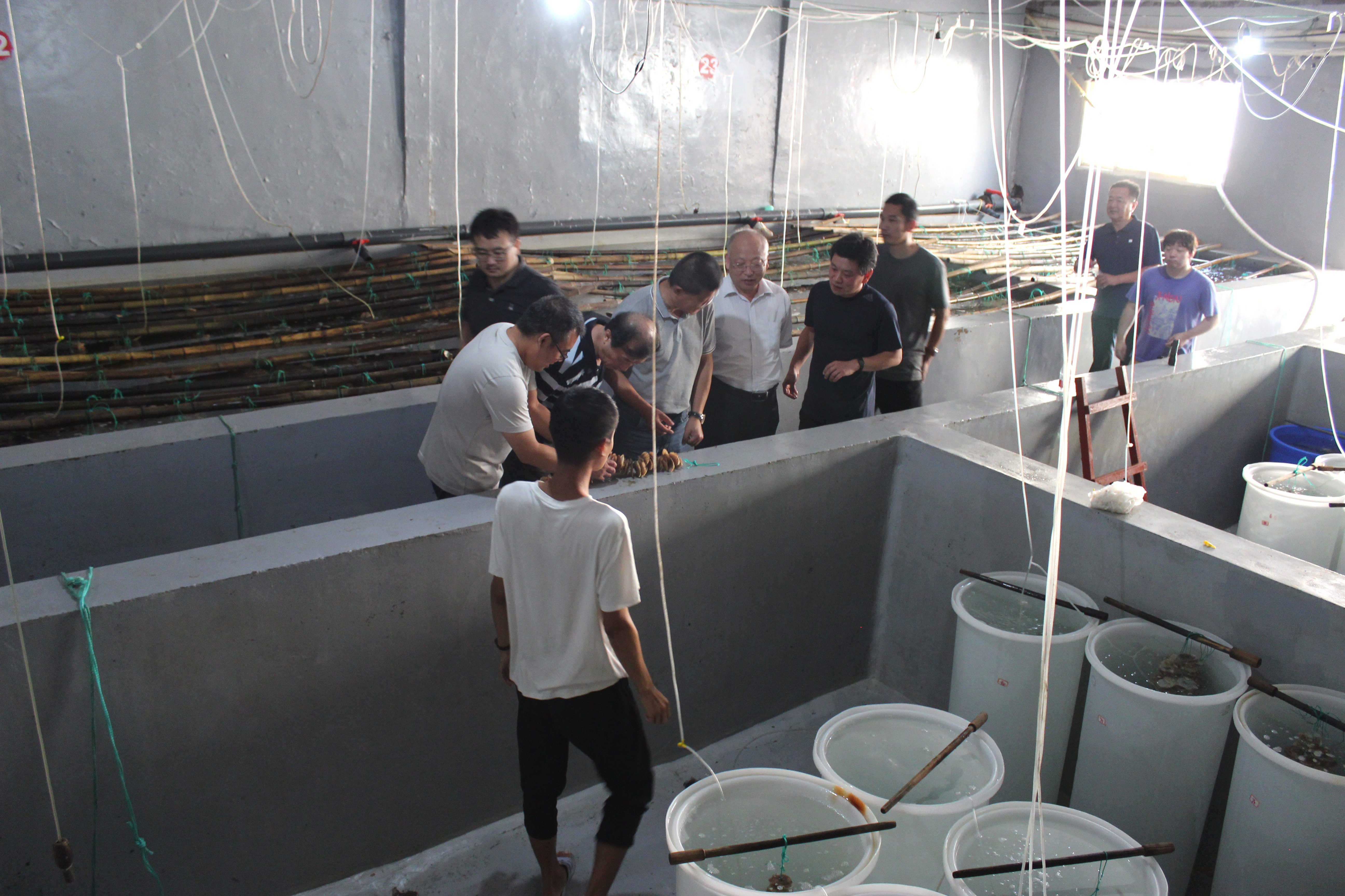 項目組匯報了近江牡蠣良種選育及苗種培育總體情況。驗收專家聽取了工作匯報,現(xiàn)場查驗了近江牡蠣群體、家系構(gòu)建和苗種擴(kuò)繁的生產(chǎn)和實(shí)驗記錄。在生產(chǎn)車間,專家組對群體和家系數(shù)量進(jìn)行計數(shù),并隨機(jī)取樣統(tǒng)計擴(kuò)繁苗種數(shù)量,檢查苗種生長和健康狀態(tài)。經(jīng)統(tǒng)計,項目組2022年培育近江牡蠣家系48個、健康稚貝31.2萬粒;健康群體稚貝1436萬粒。
