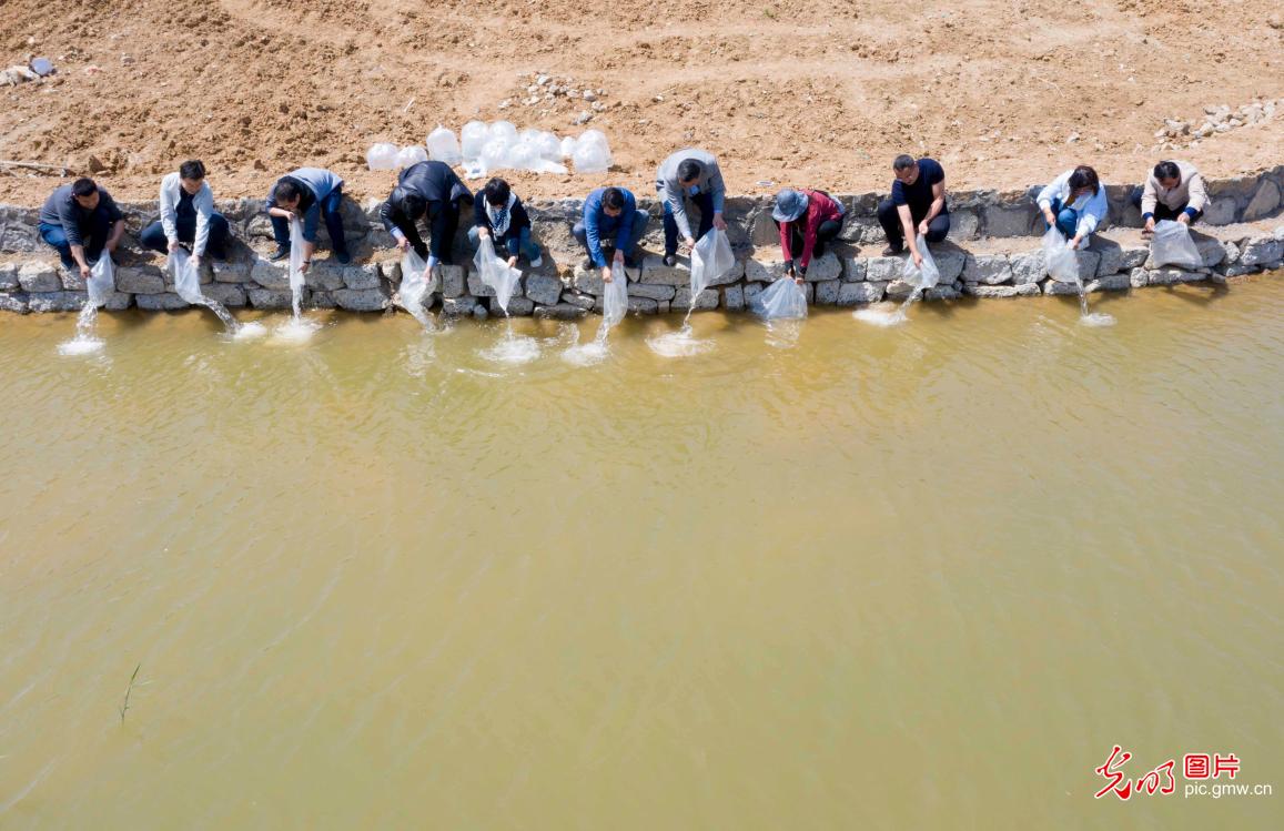 2021年5月5日,中國水產(chǎn)科學(xué)研究院黃海水產(chǎn)研究所的科研人員,在山東青島西海岸新區(qū)知山樂禾新田園公社,把2000尾嶗山仙胎魚(學(xué)名香魚)魚苗投放到園區(qū)的水系之中。嶗山仙胎魚是一種珍稀淡水魚,有"嶗山中華鱘"之美譽(yù)。(韓加君攝/光明圖片)