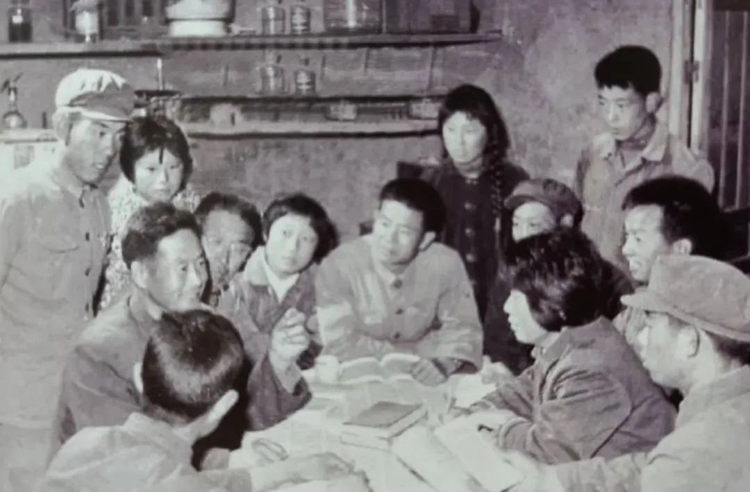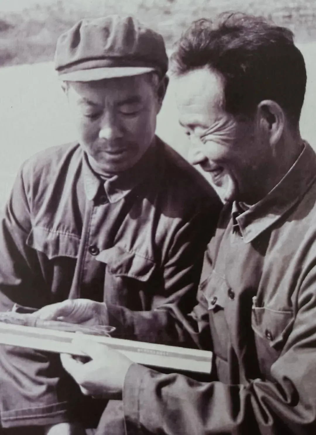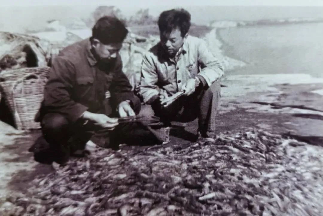1973年秋,趙法箴(左一)和同事觀察人工養(yǎng)殖收獲的對蝦