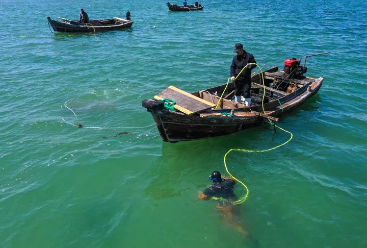 在東楮島海域,漁民們在科研人員的帶領下移植鰻草幼苗。李信君 攝