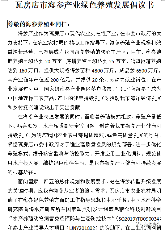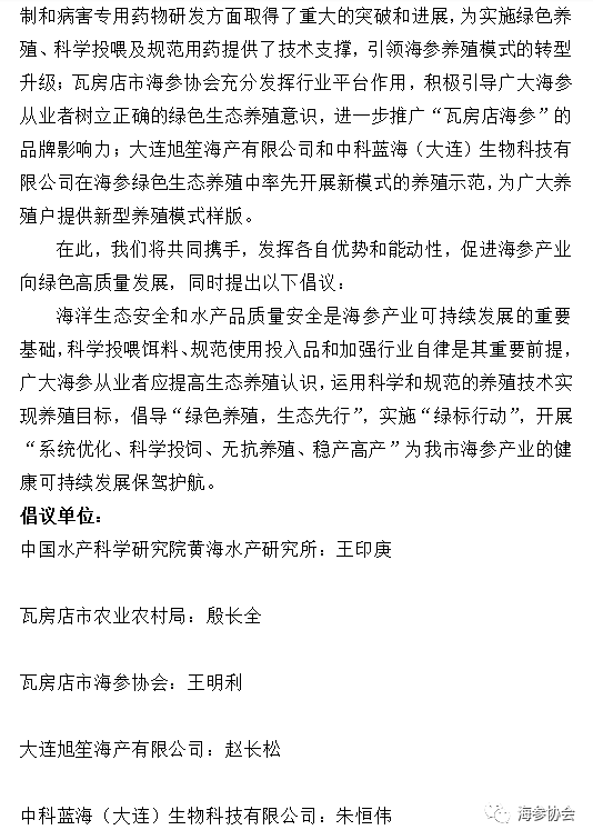 2月28日,由中國(guó)水產(chǎn)科學(xué)研究所、瓦房店市農(nóng)業(yè)農(nóng)村局、瓦房店市海參協(xié)會(huì)、大連旭笙海產(chǎn)有限公司、中科藍(lán)海(大連)生物科技有限公司等多家涉海養(yǎng)殖單位,在位于遼刺參主產(chǎn)區(qū)的瓦房店市謝屯鎮(zhèn)沙山村的旭笙海產(chǎn)公司共同發(fā)起倡議,實(shí)施中國(guó)水產(chǎn)科學(xué)研究院黃海水產(chǎn)研究所重點(diǎn)研發(fā)“藍(lán)色糧倉(cāng)”科技創(chuàng)新項(xiàng)目“水產(chǎn)養(yǎng)殖動(dòng)物病害免疫預(yù)防與生態(tài)防控技術(shù)”(sq2019yfd090034)和泰山產(chǎn)業(yè)領(lǐng)導(dǎo)人才項(xiàng)目(LjNY201802)下的工業(yè)化飼料研制和病害專用藥物研發(fā),以科學(xué)投喂和規(guī)范用藥引領(lǐng)傳統(tǒng)海參養(yǎng)殖模式的轉(zhuǎn)型升級(jí),從海洋生態(tài)安全和水產(chǎn)品質(zhì)量安全的高度,倡導(dǎo)“綠色養(yǎng)殖,生態(tài)先行”的養(yǎng)殖新模式,以科學(xué)手段和技術(shù)支撐,促進(jìn)遼刺參主產(chǎn)區(qū)養(yǎng)殖業(yè)轉(zhuǎn)型升級(jí),提質(zhì)增效。