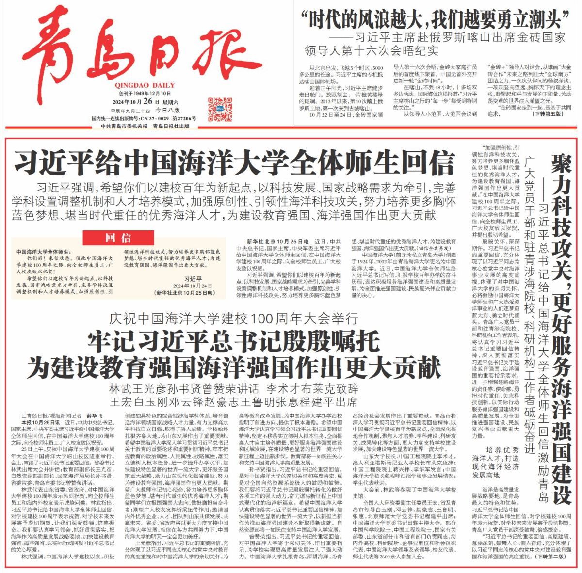 “加強原創(chuàng)性、引領(lǐng)性海洋科技攻關(guān),努力培養(yǎng)更多胸懷藍色夢想、堪當(dāng)時代重任的優(yōu)秀海洋人才,為建設(shè)教育強國、海洋強國作出更大貢獻。”在中國海洋大學(xué)建校100周年之際,習(xí)近平總書記給中國海洋大學(xué)全體師生回信,向全校師生員工、廣大校友致以祝賀,并提出殷切希望。