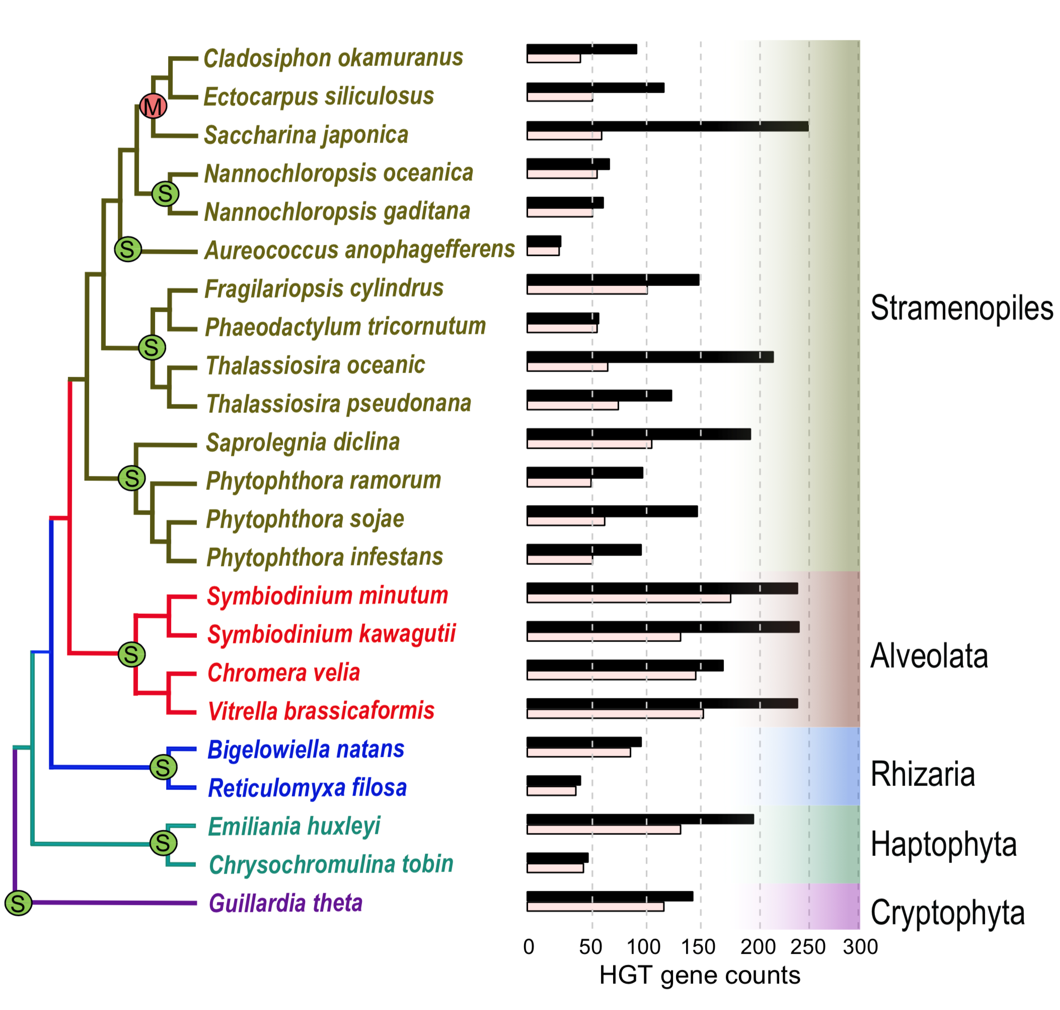 水平基因轉(zhuǎn)移(HGT),又稱側(cè)向基因轉(zhuǎn)移(Lateral Gene Transfer,LGT),指在差異生物個體之間,或單個細(xì)胞內(nèi)部細(xì)胞器之間所進(jìn)行的遺傳物質(zhì)的交流。水平基因轉(zhuǎn)移為什么會發(fā)生在眾多的物種中以及如何發(fā)生?什么決定了物種的生物多樣性?這些未解之謎被Science雜志列入全球最前沿的125個科學(xué)問題。囊泡藻界(Chromalveolata)系真核生物域六界之一,為雙鞭毛真核生物與紅藻發(fā)生單獨(dú)的內(nèi)共生后衍生出的所有后代物種的統(tǒng)稱,包括硅藻、甲藻以及大型褐藻等在內(nèi)的多個重要類群,是近岸和大洋重要的初級生產(chǎn)者。