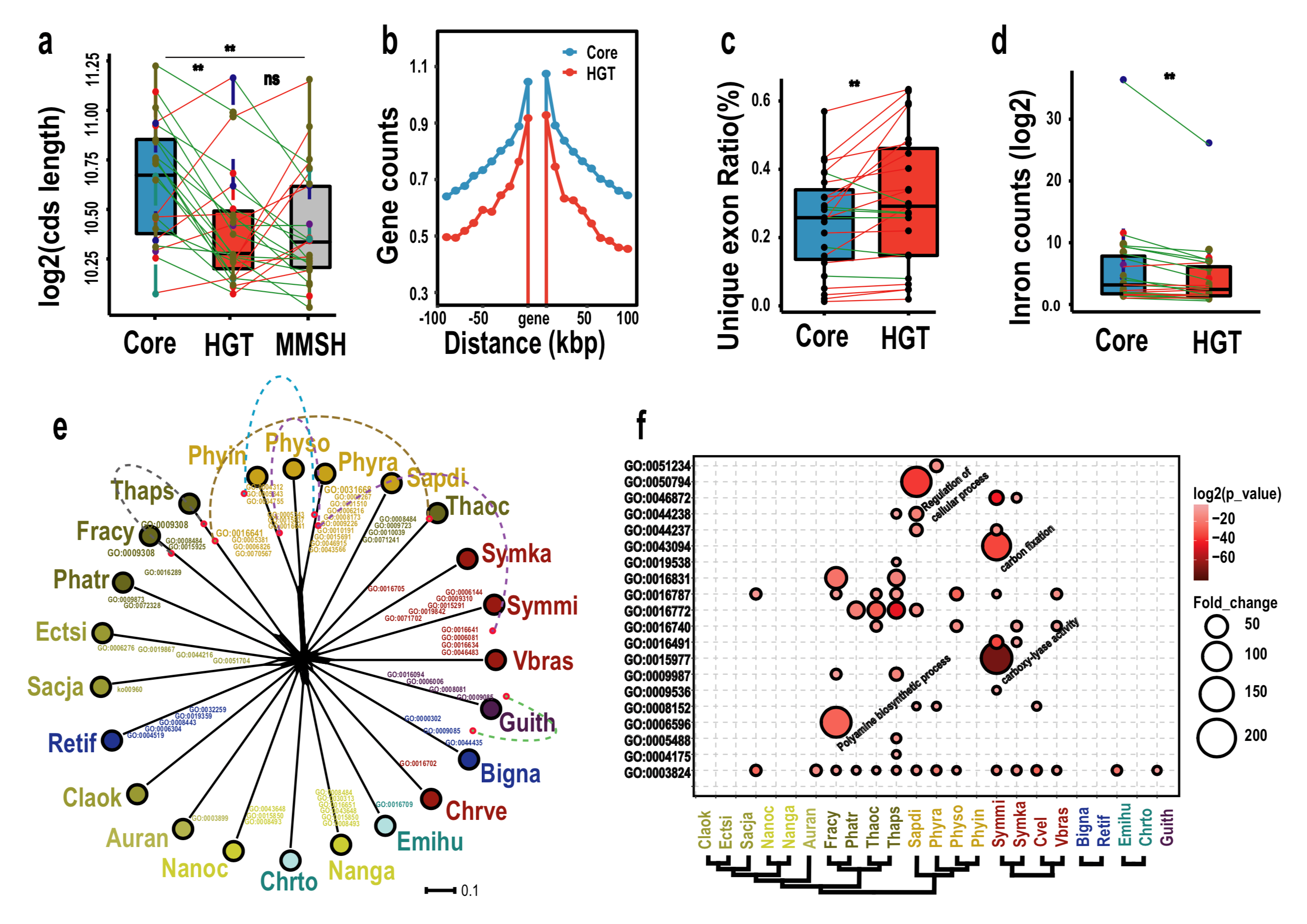 研究聚焦囊泡藻界5大類群(CRASH:Cryptophytes,Rhizarians,Alveolates,Stramenopiles和Haptophytes)中的23個代表性物種,在獲得全基因組序列的基礎(chǔ)上,采用序列相似度和系統(tǒng)發(fā)育樹形分析為主要研究手段,輔以基因組拼接評估和側(cè)翼基因同源性排除污染,通過自主研發(fā)的HGT樹形篩選工具(NestedIN),最終在23個物種分別獲得0.16-1.44%不等的高可信度水平轉(zhuǎn)移基因。研究揭示了真核宿主對原核HGT基因具有“馴化”效應(yīng),發(fā)現(xiàn)HGT基因有效推動了CRASH類群物種的環(huán)境適應(yīng)能力,促進(jìn)了物種演化分歧,對當(dāng)今CRASH類群物種多樣性格局的形成具有重要貢獻(xiàn)。