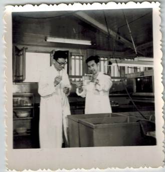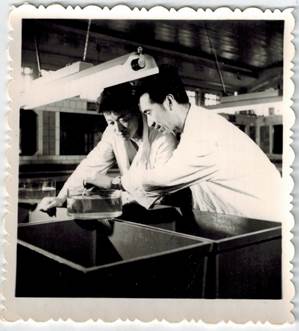 1970-1971年期間,與王者茂先生一起研究牙鲆繁育(右一)