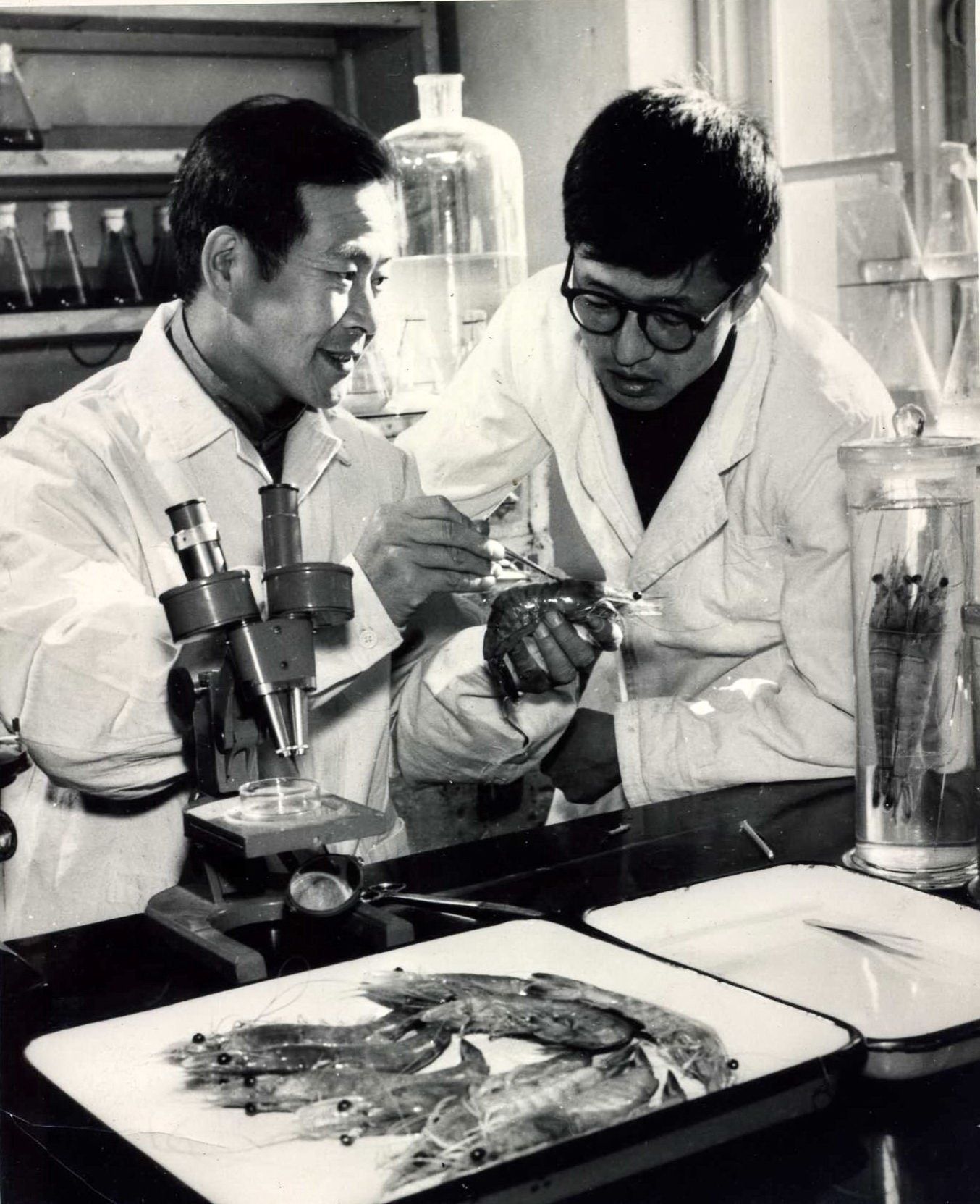 1960年趙院士和同事一起撈取并觀察蝦池水中的浮游生物